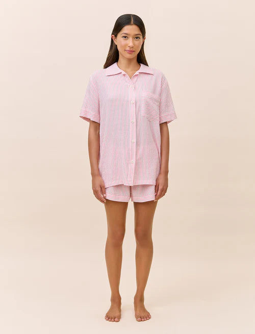 Add a touch of timeless charm to your loungewear with the Seersucker stripe boxer pyjama set. Crafted from a soft blend of cotton and Lenzing Ecovero viscose, this set combines lightness and breathability for ultimate comfort. The classic stripes paired with a textured seersucker is perfect for lounging or a restful night’s sleep.