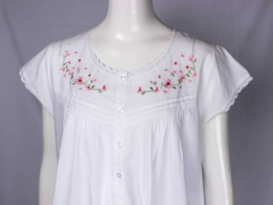 Lovely cotton nightie embroidered , with cap sleeves, a cotton neckline and pintucks in the skirt—perfect for warm summer nights.