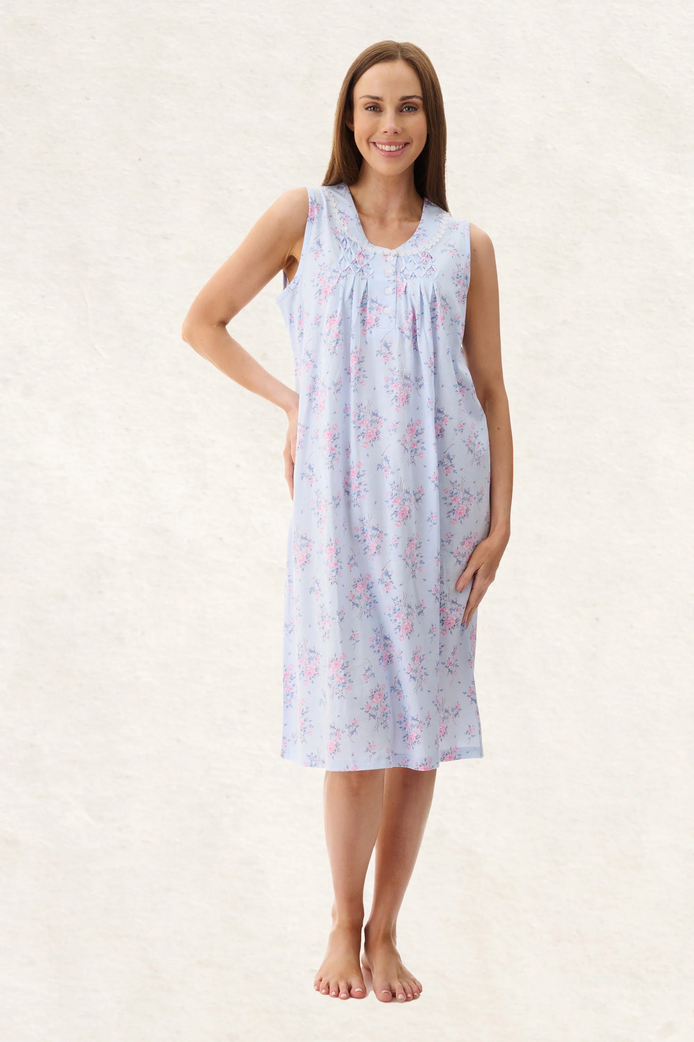 A gorgeous blue floral print on 100% cotton knit jersey. This sleeveless short nightie is a lovely choice for hot summer nights. This nightie has self binding on the armholes, a vee shaped neckline, with narrow lace detail. Crisscross pleating detail either side of the button placket.