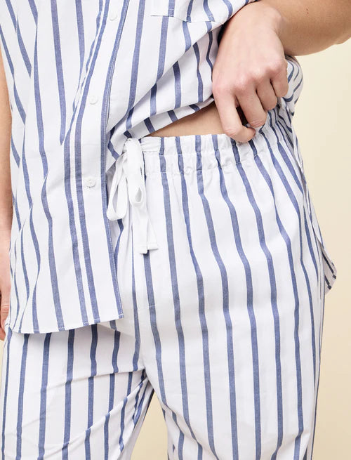 This timeless set is crafted from 100% cotton poplin in a delicate blue and white stripe. Light and breathable, they’re designed for easy comfort on warm nights or relaxed mornings at home.