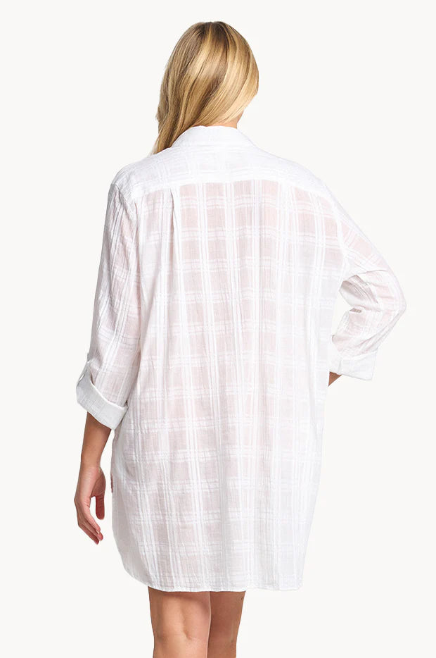 Sunseeker Picnic Painters Shirt in White features collared neckline, V-front placket, long sleeves, back yoke with pleats.