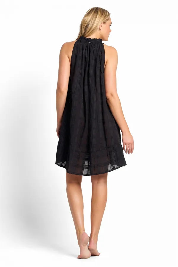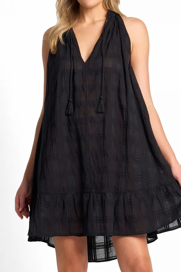 Sunseeker Picnic Throw Over in Black features an open neckline with tie and tassel ends, knee length, semi transparent fabric.
